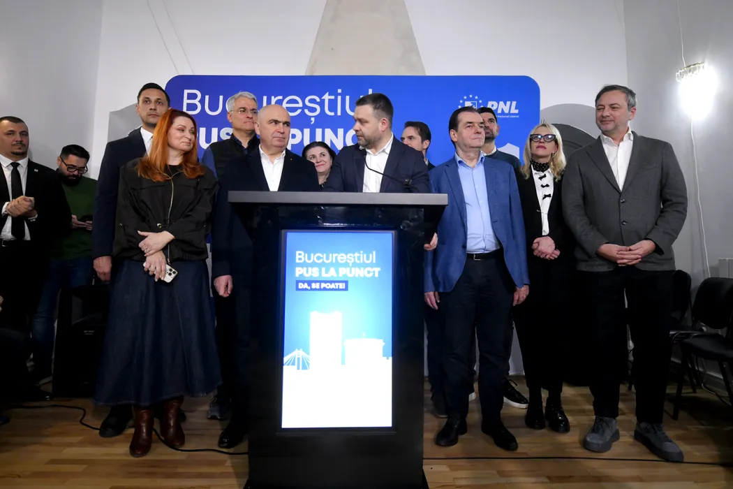 Candidatul PNL la Primaria Capitalei, Ciprian Ciucu (C), sustine un discurs dupa aflarea rezultatelor exit-pollurile pentru alegerile locale 2025, la sediul partidului din Bucuresti, duminica, 7 noiembrie 2025. ALEXANDRU DOBRE / MEDIAFAX FOTO