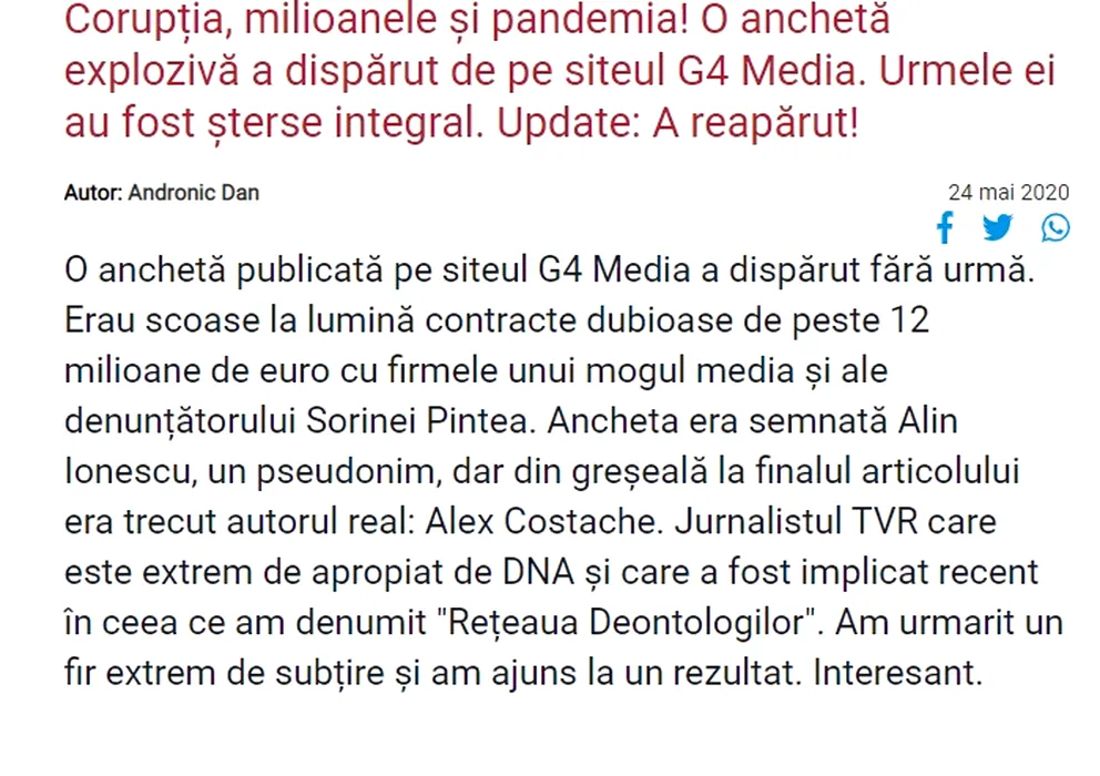 GALERIE FOTO: CIUDAT. Jurnalistul Dan Andronic: O anchetă care scotea la iveală contracte dubioase a dispărut de pe G4Media după ce autorul se semnase probabil din greșeală!