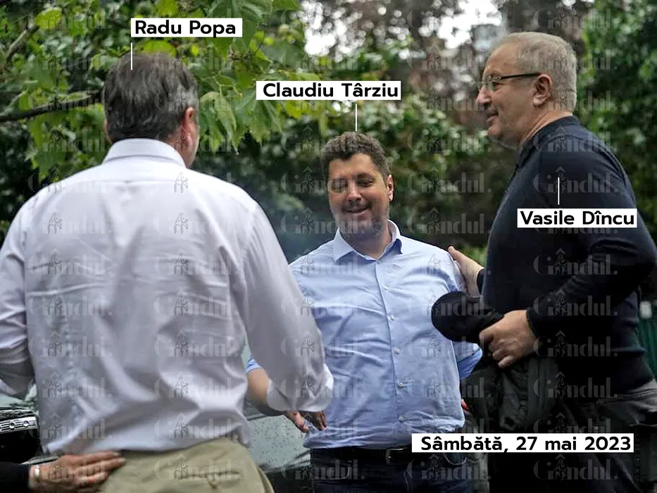 Ex-ministrul Apărării Vasile Dîncu a zăbovit la o discuție cu finul Radu Popa, fina și senatorul AUR Claudiu Târziu