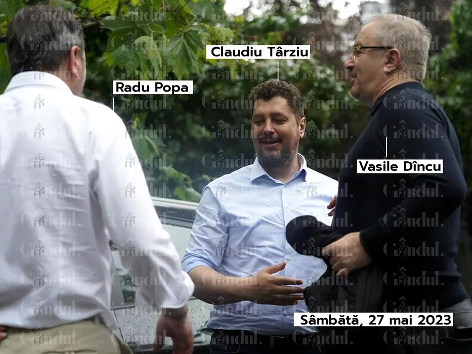 Ex-ministrul Apărării Vasile Dîncu a zăbovit la o discuție cu finul Radu Popa, fina și senatorul AUR Claudiu Târziu