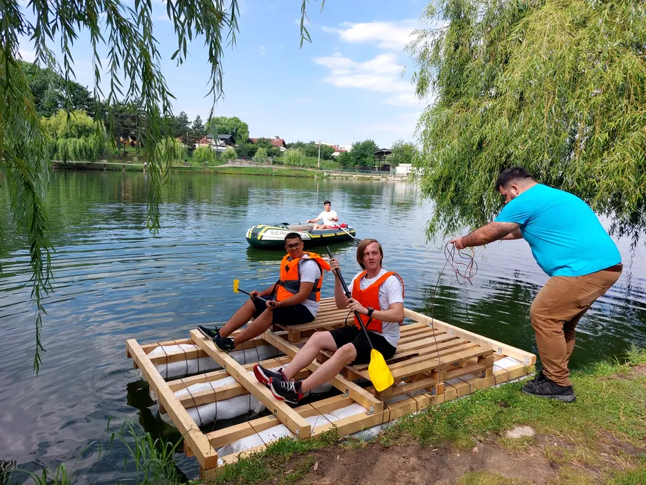 Competiție inedită pe lac, în Craiova. Mai mulți elevi s-au întrecut cu plute făcute din PET-uri
