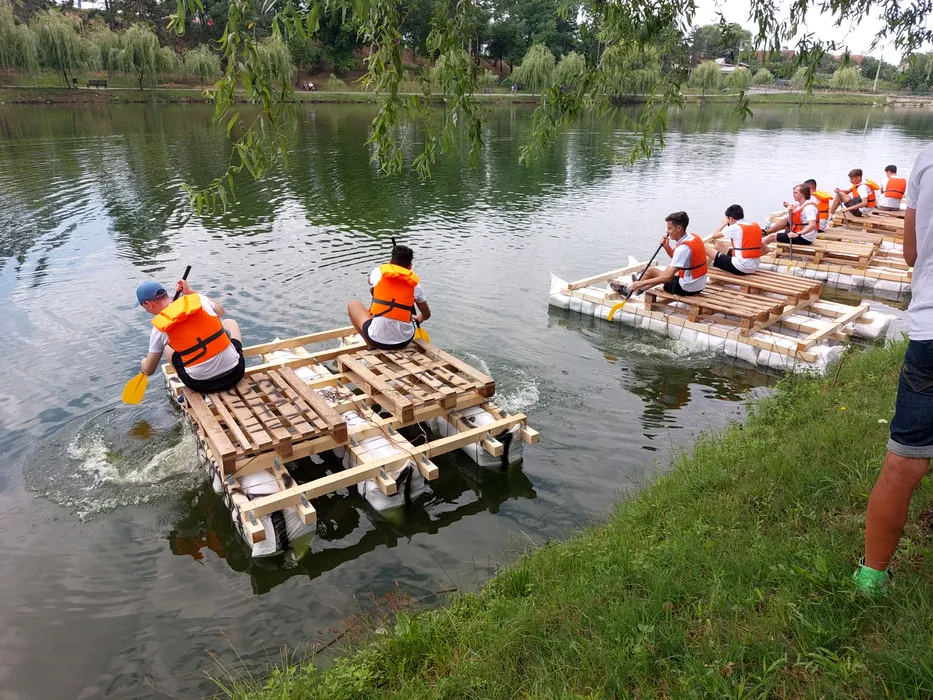 Competiție inedită pe lac, în Craiova. Mai mulți elevi s-au întrecut cu plute făcute din PET-uri
