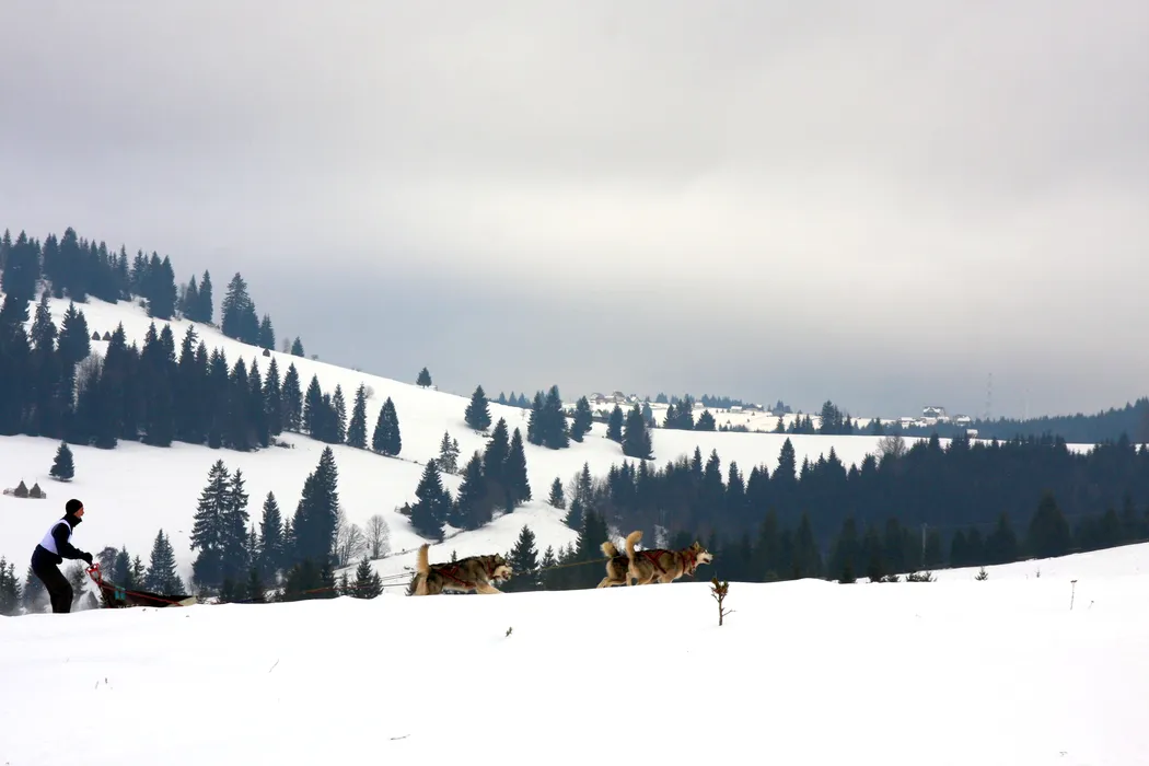 Concurs inedit în Pasul Tihuța: Sănii trase de câini Husky. GALERIE FOTO