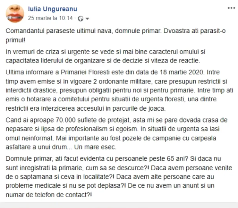 Postarea din cauza căreia a primit amendă / Sursă FOTO: Iulia Ungureanu - Facebook