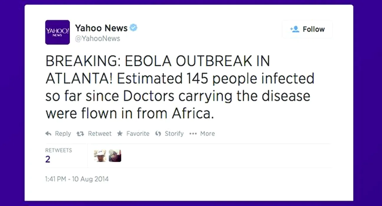 Contul de Twitter al Yahoo News a fost piratat pentru a trimite un mesaj privind o epidemie de Ebola în SUA