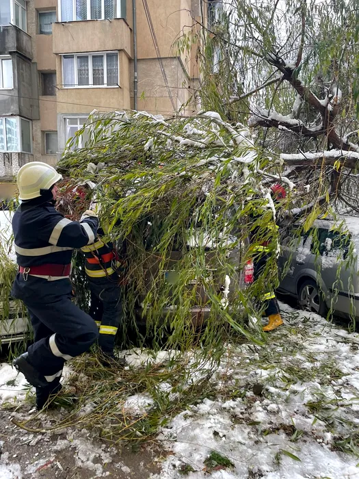 FOTO - Un copac a căzut peste trei mașini parcate pe o stradă din Suceava / Sursa foto: ISU Suceava