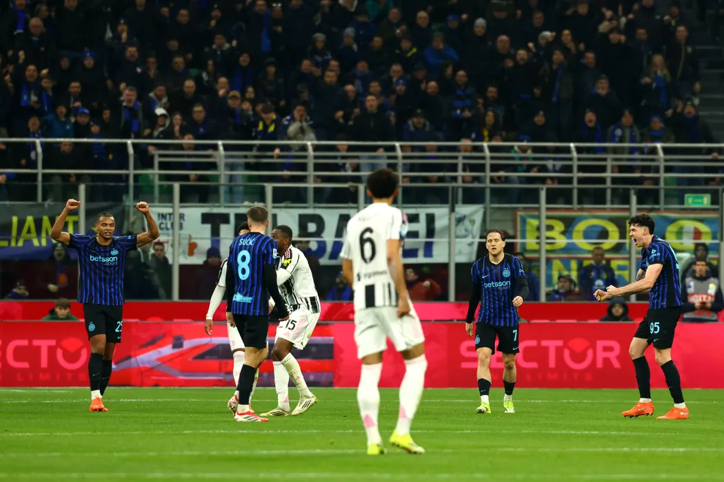 February 14, 2026, Milan, Lombary, Italy: LUIS HENRIQUE and ALESSANDRO BASTONI of Inter celebrate PIERRE KALULU of Juventus receiving his second yellow card and being sent out on Matchday 25 of 38 of the Serie A 2025/26 between INTER FC and JUVENTUS at the Giuseppe Meazza Stadium in Milan, Italy.,Image: 1075179291, License: Rights-managed, Restrictions: , Model Release: no, Credit line: Mickael Chavet / Zuma Press / Profimedia