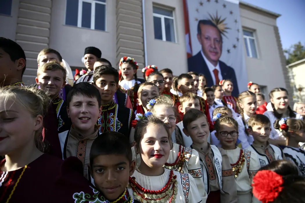 KOMRAT, MOLDOVA - OCTOBER 18: Children wearing traditional costumes pose for a photo in front of an image of President of Turkey Recep Tayyip Erdogan during the opening ceremony of a Cultural House, renovated by Altindag Municipality, in Komrat, of the Autonomous Territorial Unit of Gagauzia, on October 18, 2018. President of Turkey, Recep Tayyip Erdogan (not seen) also attended the ceremony. Ercin Top / Anadolu Agency/ABACAPRESS.COM