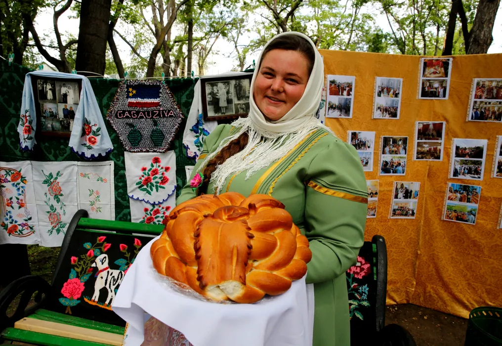 CHISINAU, MOLDAVIA - MAY 08 : A Gokoguz Christian Turk woman, wearing traditional clothes, shows a bread during the Hidirellez celebrations at Stefan Cel Mare Central Park in Gokoguz region of Moldavia on May 08, 2017. Gokoguz Christian Turks live in the Autonomous Territorial Unit of Moldavia's Gokoguz region. Murat Kaynak / Anadolu Agency