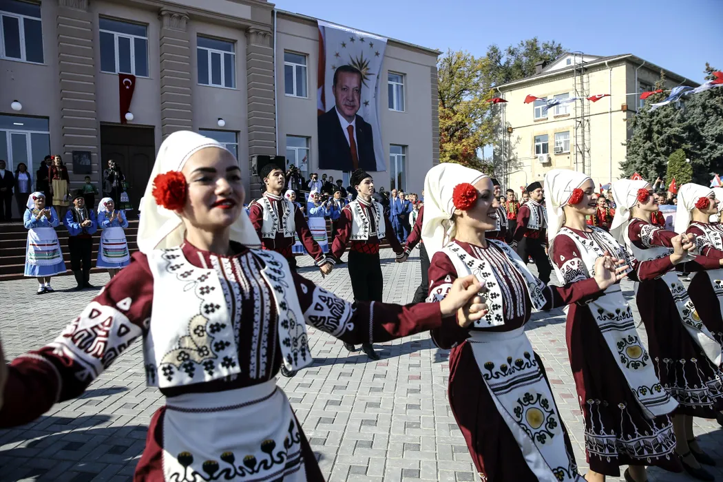 KOMRAT, MOLDOVA - OCTOBER 18: Folk dance group performs during the opening ceremony of a Cultural House, renovated by Altindag Municipality, in Komrat, of the Autonomous Territorial Unit of Gagauzia, on October 18, 2018. President of Turkey, Recep Tayyip Erdogan (not seen) also attended the ceremony. Ercin Top / Anadolu Agency/ABACAPRESS.COM