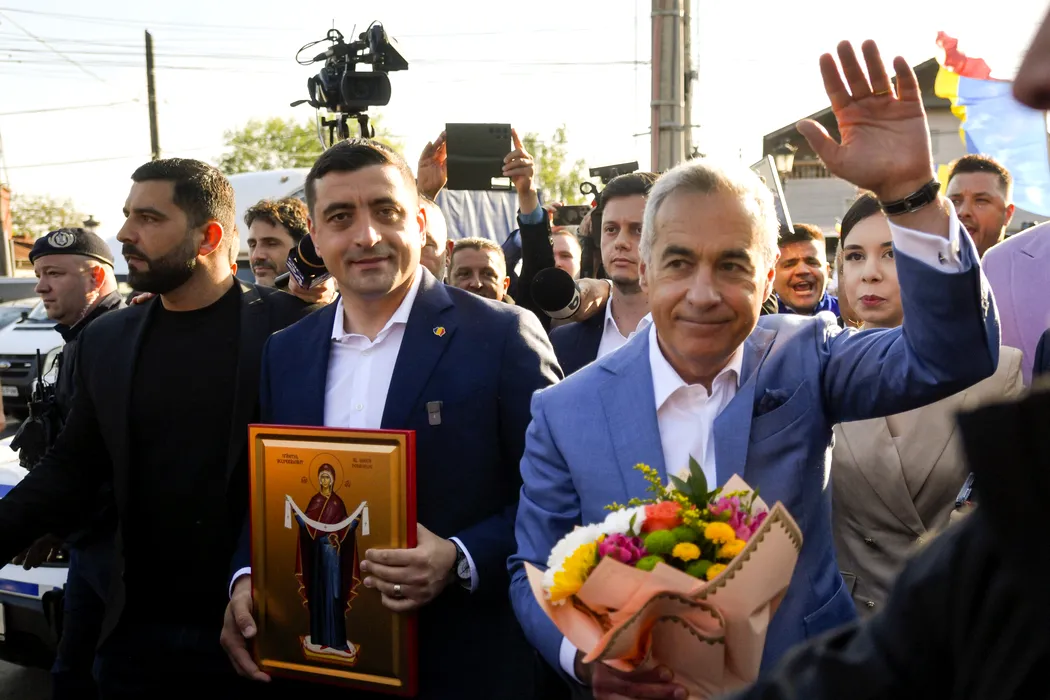 Zeci de sustinatori i-au intampinat pe George Simion (S), candidatul Aliantei pentru Unirea Romanilor( AUR) la alegerile prezidentiale, si Calin Georgescu (D) la iesirea din sectia de votare unde si-au exercitat dreptul la vot, in primul tur de scrutin al alegerilor prezidentiale, in Mogosoaia, duminica, 4 mai 2025. ALEXANDRU DOBRE/MEDIAFAX FOTO