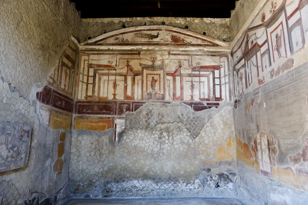 This picture shows frescoes on the walls of the House of the Tuscan Colonnade, reopened today after more than twenty-five years, at the archaeological site of Herculaneum in Ercolano on March 19, 2025.,Image: 977476034, License: Rights-managed, Restrictions: , Model Release: no