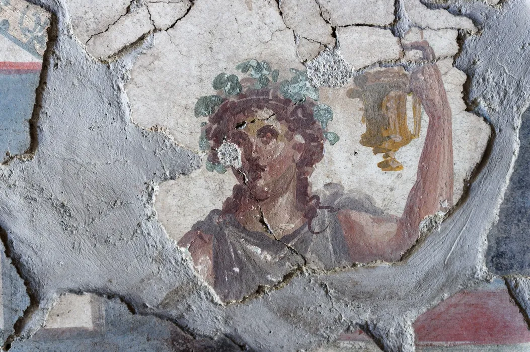This picture shows a detail of a fresco on the walls of the House of the Tuscan Colonnade, reopened today after more than twenty-five years, at the archaeological site of Herculaneum in Ercolano on March 19, 2025.,Image: 977478236, License: Rights-managed, Restrictions: , Model Release: no