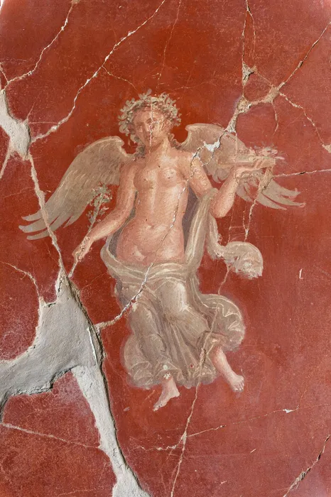 This picture shows a detail of a fresco on the walls of the House of the Tuscan Colonnade, reopened today after more than twenty-five years, at the archaeological site of Herculaneum in Ercolano on March 19, 2025.,Image: 977478248, License: Rights-managed, Restrictions: , Model Release: no