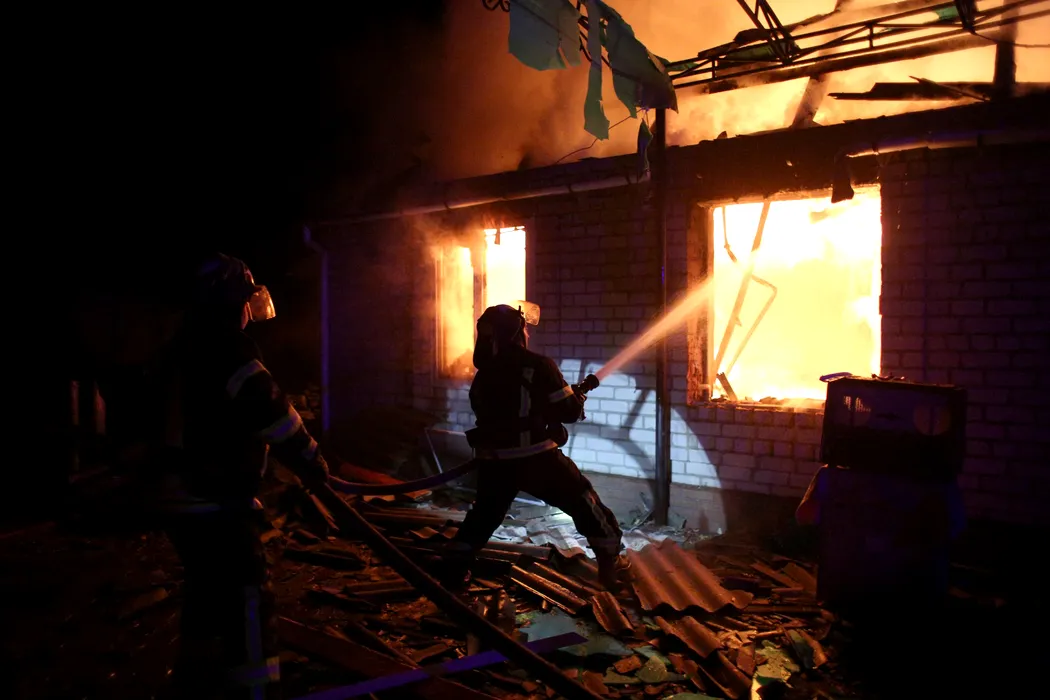 Pompierii sting un incendiu într-o casă, despre care se spune că a fost lovită de bombardamente de către separatiștii susținuți de Rusia, în așezarea Muratovo din regiunea Lugansk pe 22 februarie / Profimedia