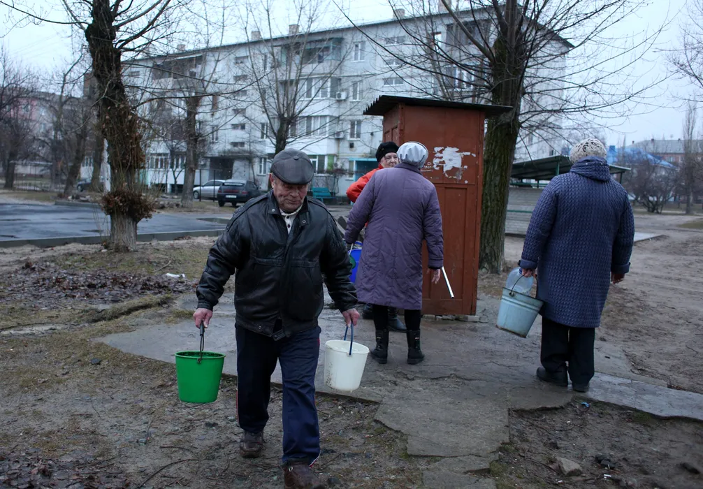Locuitorii colectează apă dintr-o fântână din orașul Schastia, în apropiere de orașul Lugansk, din estul Ucrainei, pe 23 februarie 2022, după ce stațiile de pompare ale orașului au fost blocate după bombardamente / Profimedia