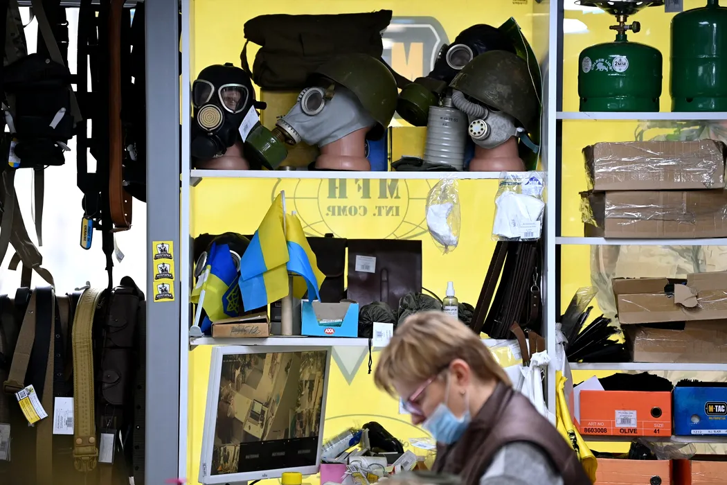 O imagine prezintă măști de gaz afișate în magazinul de echipamente militare Milika, din Kiev, pe 23 februarie 2022./ Profimedia