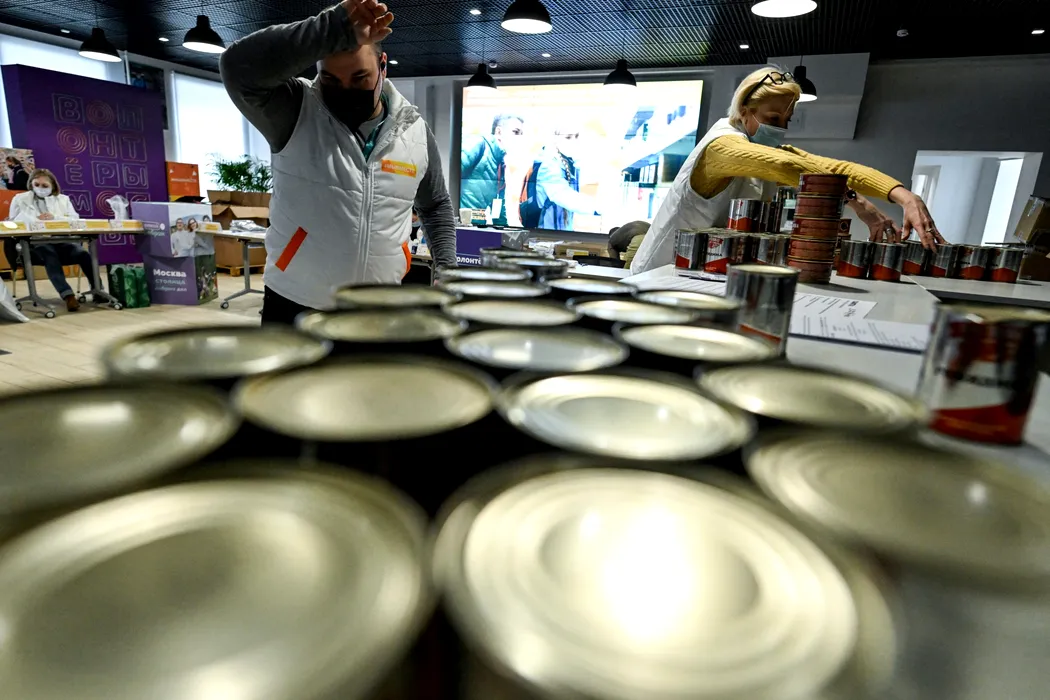 Volunteers gather food and other stuff to be sent as aid for people evacuated from the self-proclaimed Donetsk and Lugansk People's Republics into Russia, in Moscow on February 23, 2022.,Image: 664395766, License: Rights-managed, Restrictions: , Model Release: no, Credit line: Profimedia