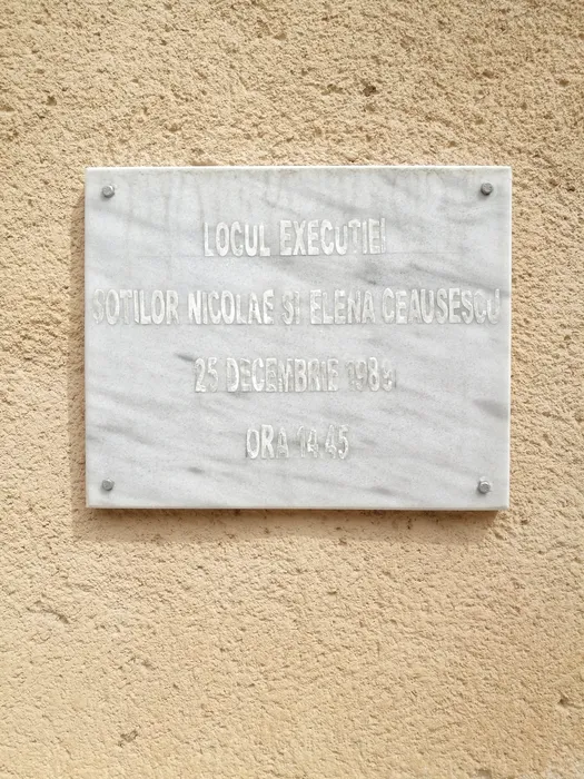 Placă din marmură, de slabă calitate, amplasată pe zidul în fața căruia au stat Ceaușeștii: "Locul execuției soților Nicolae și Elena Ceaușescu - 25 decembrie 1989 - ora 14.45". Sursa foto și descrieri: Rezistența urbană