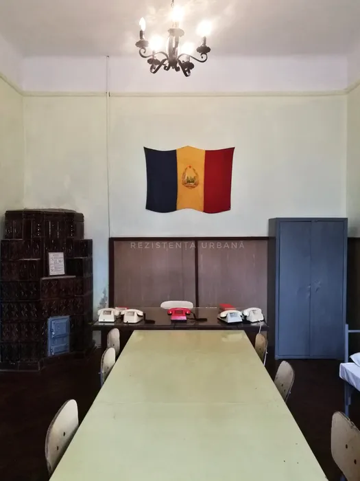 Fostul biroul al comandantului, unde a avut loc consultul medical al Ceaușeștilor în seara de 22 decembrie 1989. Drapelul Republicii Socialiste România (RSR) e cel original, din epocă. Sursa foto și descrieri: Rezistența urbană
