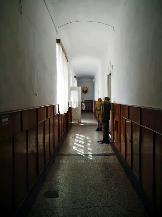 Coridorul uneia dintre aripile laterale ale clădirii duce la sala în care au dormit și mâncat Ceaușeștii între 22-25 decembrie 1989 (ușa din dreapta, străjuită de uniforme militare), dar are ieșire și spre curtea din spate (ușa din stânga) și locul execuției de pe 25 decembrie 1989. Sursa foto și descrieri: Rezistența urbană