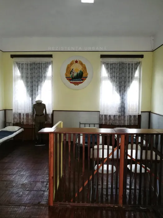 Sala în care au dormit și mâncat Ceaușeștii între 22-25 decembrie 1989. Se observă paturile cuplului prezidențial (dreapta) și uniforma și patul militarului care i-a păzit (stânga). Pe perete, între ferestre, stema Republicii Socialiste România (RSR). Sursa foto și descrieri: Rezistența urbană