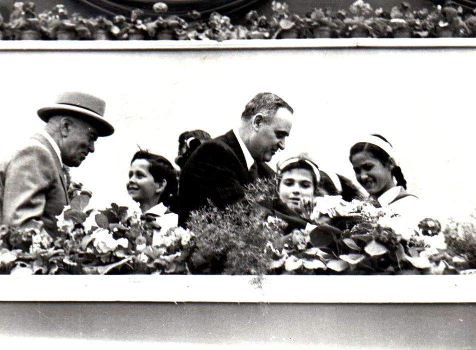 Gheorghe Gheorghiu –Dej şi P. Groza în tribuna centrală din Piaţa Aviatorilor la marea demonstraţie a oamenilor muncii, în cinstea zilei de 1 Mai – primind flori de la o delegaţie de pionieri. (01.05.1953) / Fototeca online a comunismului românesc, Cota: 22 (24)/1946