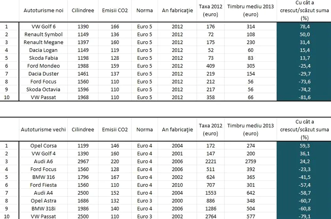 Cum s-a modificat TAXA AUTO în cazul unora dintre cele mai vândute mașini din 2012
