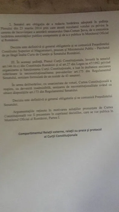 Curtea Constituțională obligă Senatul să redacteze o hotărâre după votul care l-a scăpat pe Șova de arestare