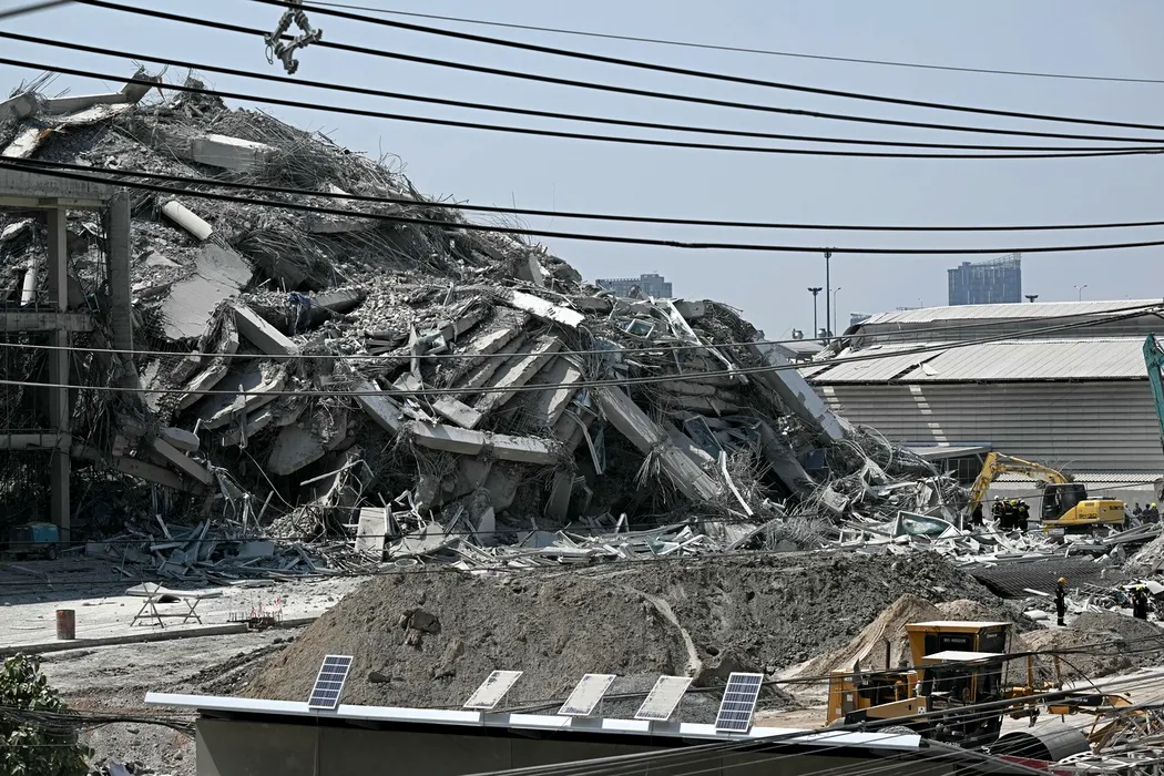 A collapsed building at a construction site is seen in Bangkok on March 28, 2025, after an earthquake. A powerful earthquake rocked central Myanmar on March 28, buckling roads in capital Naypyidaw, damaging buildings and forcing people to flee into the streets in neighbouring Thailand.,Image: 980512663, License: Rights-managed, Restrictions: , Model Release: no