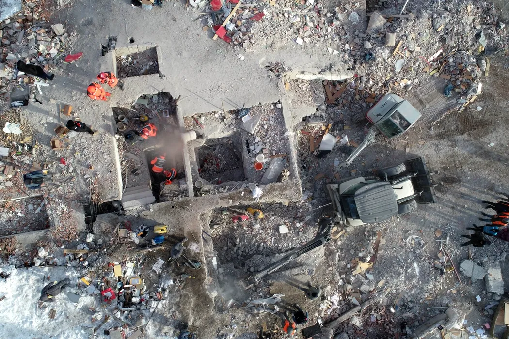 MALATYA, TURKIYE - FEBRUARY 08: An aerial view of the collapsed buildings while search and rescue efforts continue in Malatya after 7.7 and 7.6 magnitude earthquakes hit multiple provinces of Turkiye including Malatya, Turkiye on February 07, 2023. Early Monday morning, a strong 7.7 earthquake, centered in the Pazarcik district, jolted Kahramanmaras and strongly shook several provinces, including Gaziantep, Sanliurfa, Diyarbakir, Adana, Adiyaman, Malatya, Osmaniye, Hatay, and Kilis. Later, at 13.24 p.m. (1024GMT), a 7.6 magnitude quake centered in Kahramanmaras' Elbistan district struck the region. Turkiye declared 7 days of national mourning after deadly earthquakes in southern provinces. Sercan Kucuksahin / Anadolu Agency/ABACAPRESS.COM,Image: 754755696, License: Rights-managed, Restrictions: , Model Release: no
