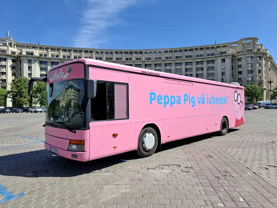 Dacă ești bucureștean, afli că „Peppa Pig te iubește!” de pe un autocar roz care circulă pe străzile Capitalei. Legătura cu Cristian Popescu Piedone