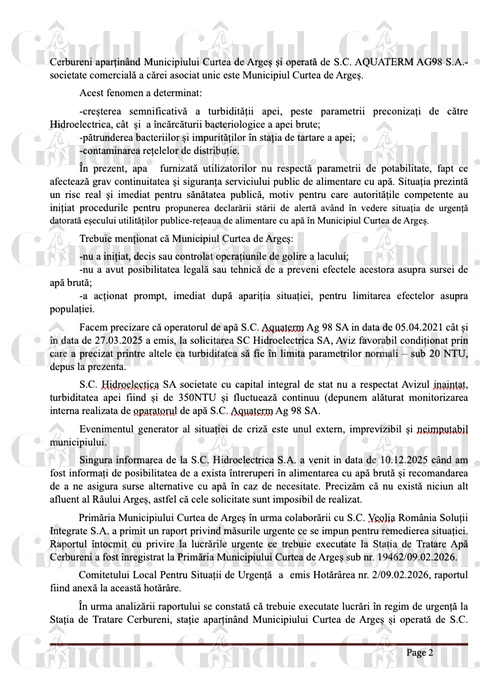 GALERIE FOTO: Deblocarea crizei apei de la Curtea de Argeș stă în semnătura lui Bolojan. Primăria a cerut guvernului 2 milioane de euro pentru acțiunile de decontaminare și pentru reluarea furnizării apei potabile, dar premierul amână o decizie. Gândul publică documentul de pe masa lui Bolojan