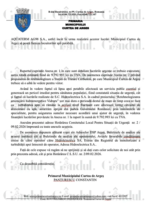 GALERIE FOTO: Deblocarea crizei apei de la Curtea de Argeș stă în semnătura lui Bolojan. Primăria a cerut guvernului 2 milioane de euro pentru acțiunile de decontaminare și pentru reluarea furnizării apei potabile, dar premierul amână o decizie. Gândul publică documentul de pe masa lui Bolojan