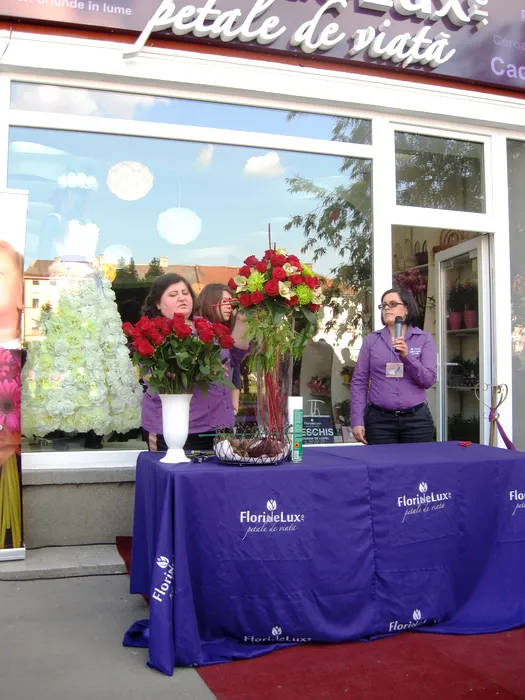 Demonstrație publică de aranjamente florale, la inaugurarea celei mai noi florării din Arad
