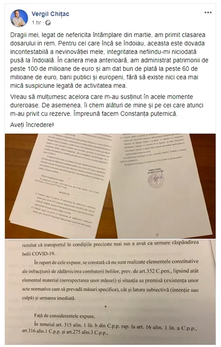 Senatorul Vergil Chițac anunță: Am primit clasarea dosarului in rem. Aceasta este dovada incontestabilă a nevinovăției mele! / Sursă FOTO: Vergil Chițac - Facebook