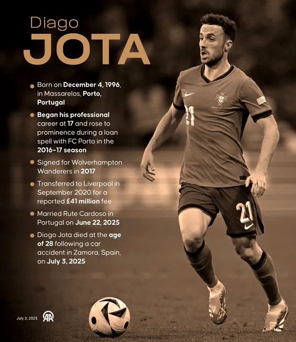ANKARA, TURKIYE - JULY 3: An infographic titled 'Portugal and Liverpool Forward Dies Aged 28' is created in Ankara, Turkiye on July 3, 2025. Liverpool forward Diogo Jota, 28, dies in car crash in Spain. Bedirhan Demirel / Anadolu/ABACAPRESS.COM,Image: 1017963328, License: Rights-managed, Restrictions: , Model Release: no