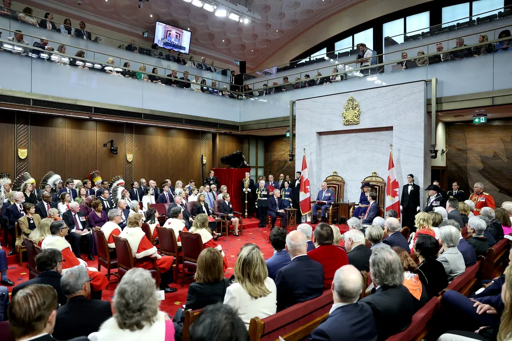 Regele Charles al III-lea și regina Camilla în Camera Senatului pentru deschiderea de stat a Parlamentului în timpul unei vizite oficiale în Canada pe 27 mai 2025 în Ottawa, Ontario