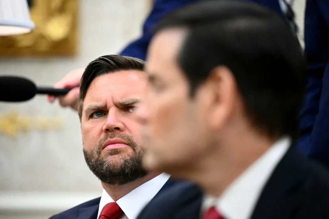 US Vice President JD Vance looks on during a meeting with US President Donald Trump and Ukrainian President Volodymyr Zelensky in the Oval Office of the White House in Washington, DC, on August 18, 2025. European leaders join Ukrainian President Volodymyr Zelensky in talks with US President Donald Trump on August 18, as they try to find a way to end Russia's offensive. The leaders heading to Washington on Monday to appear alongside Zelensky call themselves the "coalition of the willing.",Image: 1030136754, License: Rights-managed, Restrictions: , Model Release: no