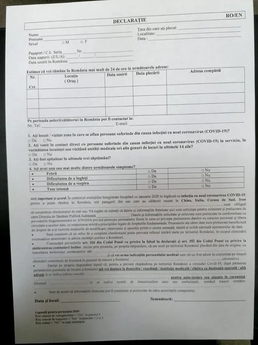 DOCUMENT. Cum arată declarația pe propria răspundere pe care trebuie să o completeze cei care intră pe teritoriul României – FOTO