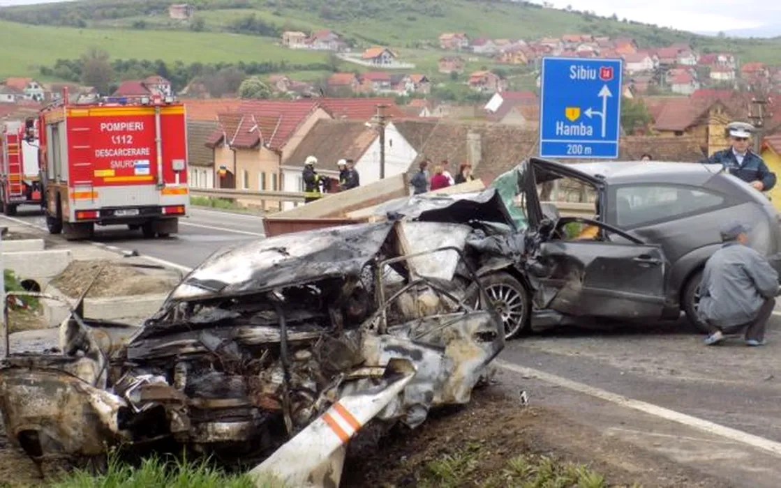 Doi morți și patru răniți în Sibiu, după ce un autoturism a intrat pe contrasens și a izbit frontal un altul, care a luat foc