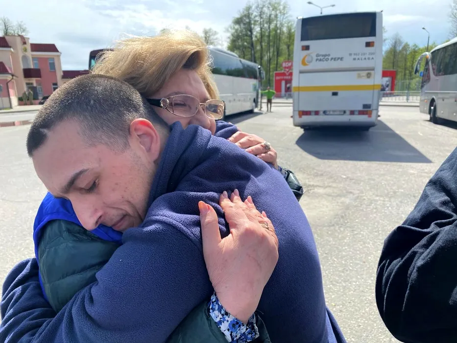 Comisarul rus pentru drepturile omului, Tatyana Moskalkova, îmbrățișează un militar rus într-o locație nedezvăluită din Belarus, după ce Rusia și Ucraina au organizat un schimb de prizonieri de război, pe 6 mai 2025.