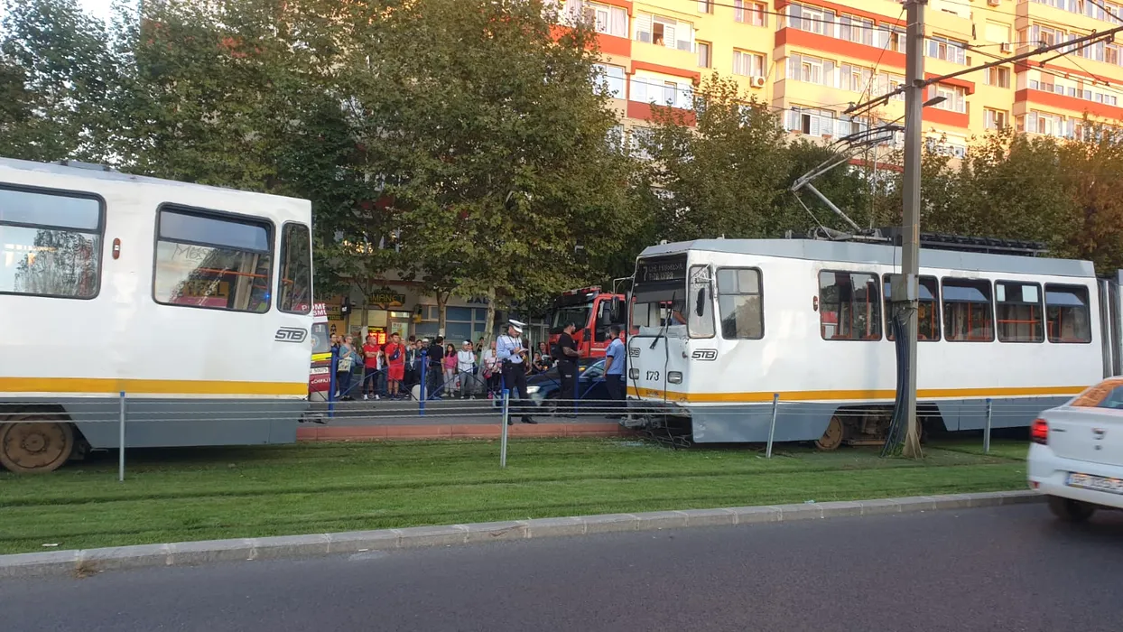 FOTO-VIDEO | Două tramvaie s-au ciocnit într-o stație de pe Șoseaua Giurgiului din Capitală. STB anchetează accidentul, soldat cu rănirea a trei persoane
