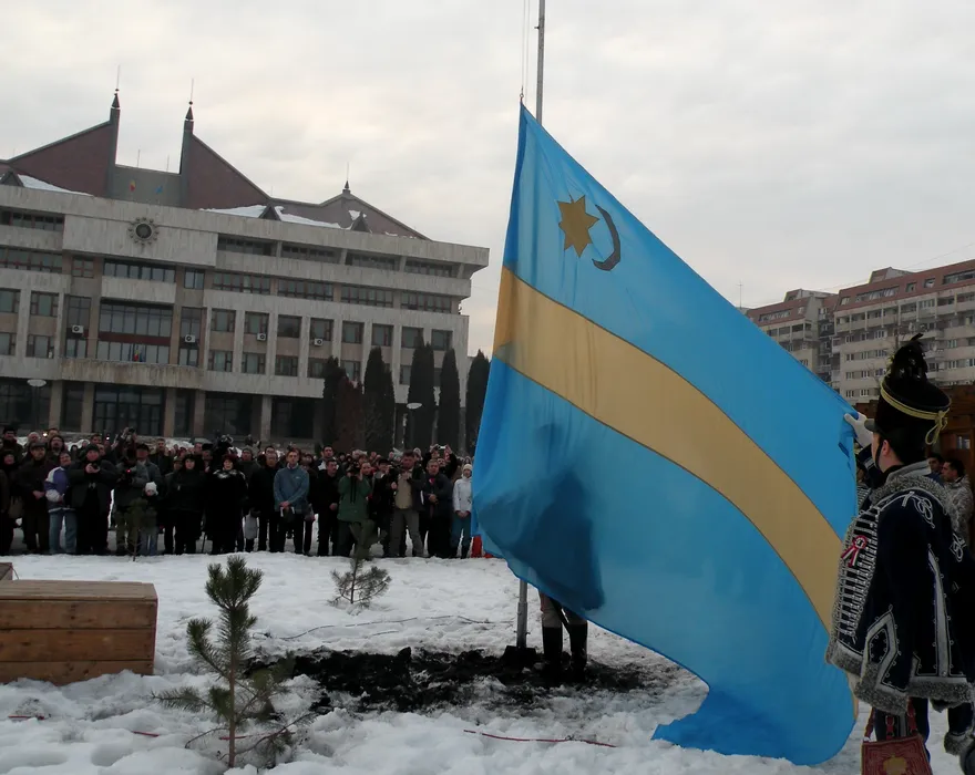 GALERIE FOTO: Drapel secuiesc de dimensiuni mari, arborat de PPMT în centrul municipiului Miercurea Ciuc