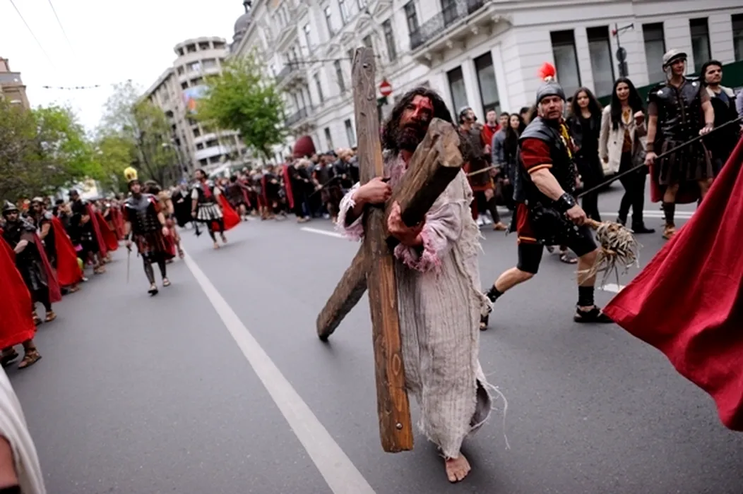„Drumul Crucii”, refăcut în centrul Capitalei de artistul Daniel Leș. „Ce s-ar întâmpla dacă Iisus ar trece acum printre noi?”. GALERIE FOTO
