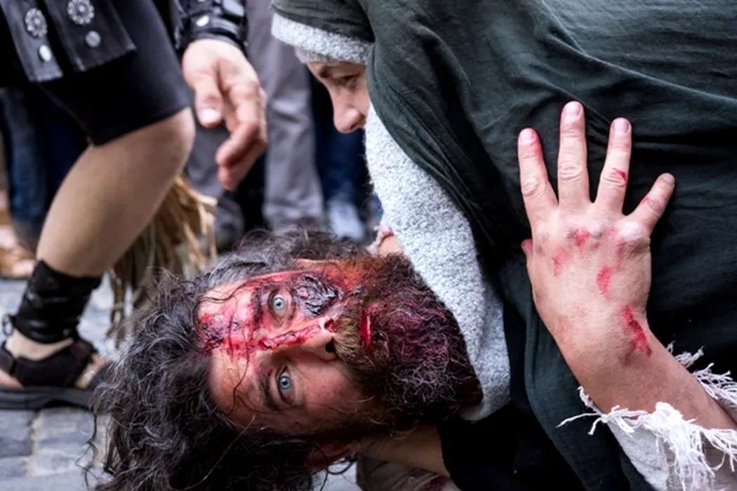 „Drumul Crucii”, refăcut în centrul Capitalei de artistul Daniel Leș. „Ce s-ar întâmpla dacă Iisus ar trece acum printre noi?”. GALERIE FOTO