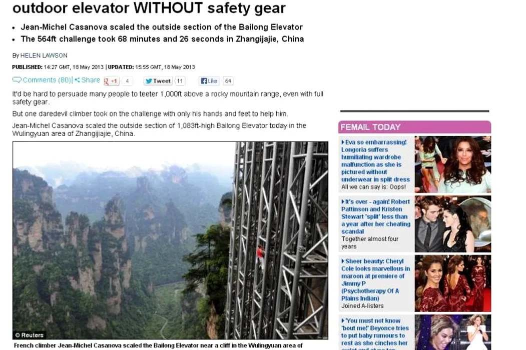 El este omul care a escaladat fără protecție liftul exterior dintr-un lanț muntos din China