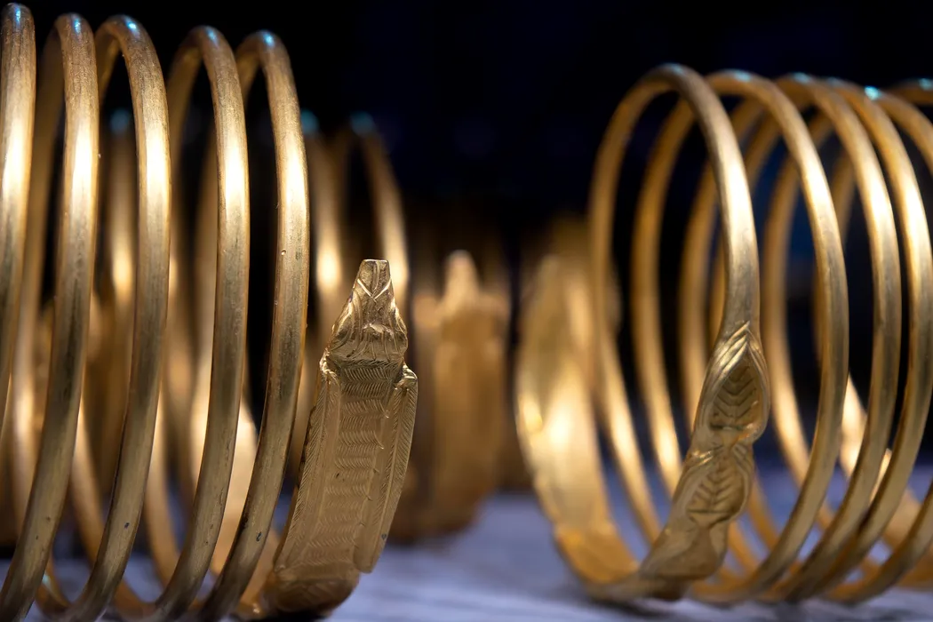 Three solid gold Dacian bracelets were stolen, along with the Golden Helmet of Cotofenesti, a solid gold Geto-Dacian helmet dating from the second half of the 5th century BCE (not in picture), during the night of January 24-25, 2025, from the Drents Museum on the Brink in Assen, Netherlands. These artifacts were exhibited alongside other ancient gold and silver treasures belonging to the National Museum of History of Romania. FILE PHOTO: The Helmet of Coofeneti, solid gold, exhibited in the treasure hall of National Museum of Romanian History during the Long Night of Museums, on May 19, 2025