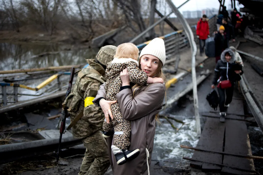 A woman hold her baby as she crosses a destroyed bridge as they evacuate the city of Irpin, northwest of Kyiv, during heavy shelling and bombing on March 5, 2022, 10 days after Russia launched a military invasion on Ukraine.,Image: 666499825, License: Rights-managed, Restrictions: , Model Release: no, Credit line: Profimedia