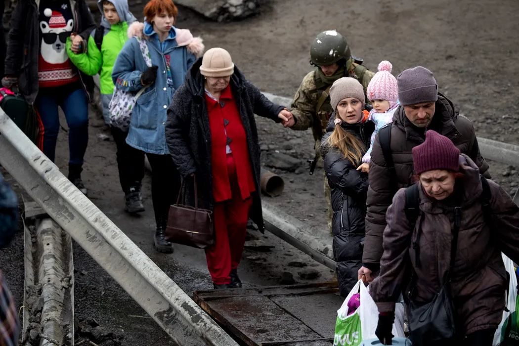 Soldiers help people cross a destroyed bridge as they evacuate the city of Irpin, northwest of Kyiv, during heavy shelling and bombing on March 5, 2022, 10 days after Russia launched a military invasion on Ukraine.,Image: 666499453, License: Rights-managed, Restrictions: , Model Release: no, Credit line: Profimedia